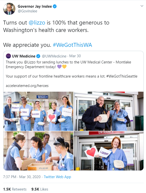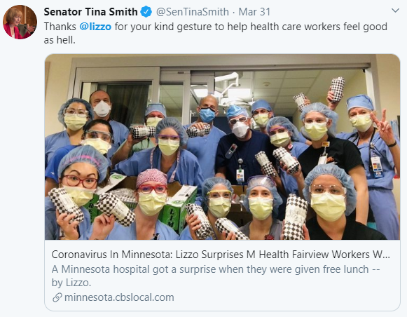 Shout out to Lizzo for this amazing gesture. Thank you, frontline workers, (i.e. health care, grocery, trucking, mail, warehouse, etc.) for caring for our health and well-being during this time of uncertainty and vulnerability. The uplifting acts of generosity that individuals from all walks of life are doing is making a positive difference for individuals, communities, our country, & the world. We are all in this fight (against COVID-19) together. Let us all continue to live, work, play, and pray together…keeping in mind social distancing of course!