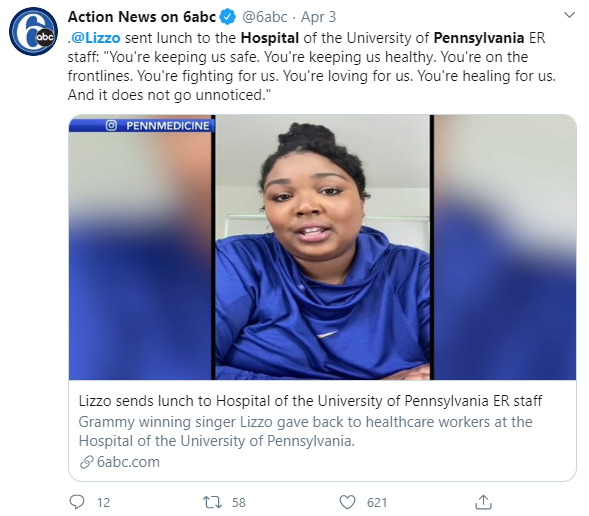 As many across the country are quarantined due to COVID-19 (Coronavirus) and as the number of deaths due to COVID-19 continue to rise, it is good to remember our men and women who are on the frontlines of this health battle. Many of the nation’s health workers are laboring long hours with minimal resources to confront this new disease. In an awesome gesture of gratitude, the recording artist Lizzo sponsored lunch for emergency hospital workers on the frontlines of COVID-19. Lizzo posted on Twitter her remarks to the hospital at the University of Pennsylvania, “thank you so much…you are keeping us safe, you are keeping us healthy.” Lizzo sponsored lunch for several hospitals. See the pictures and appreciations below.
